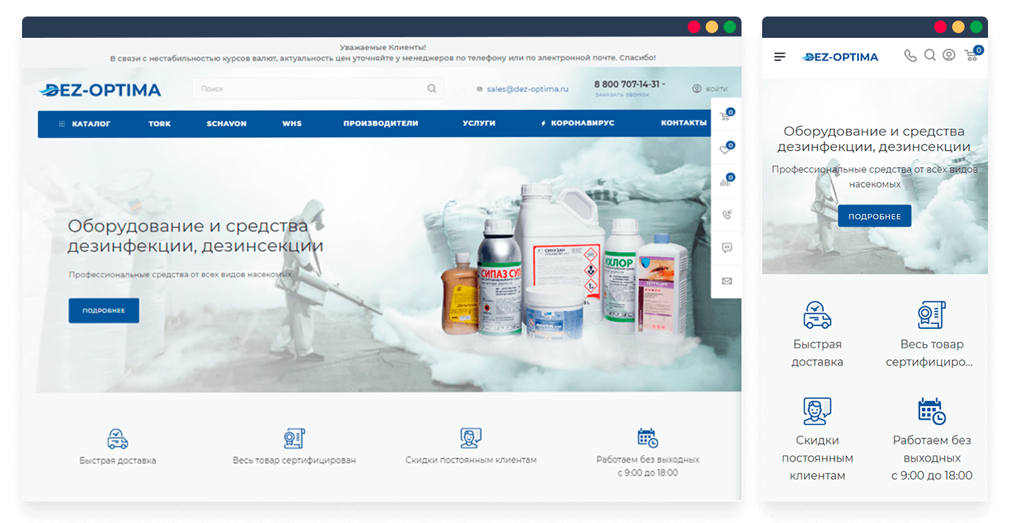 Компания Дез-Оптима занимается продажей оборудования и средств дезинфекции, предлагает широкий ассортимент гигиенической продукции, профессиональной химии и прочих товаров для торговых центров, гостиниц, производств и предприятий пищевой промышленности.