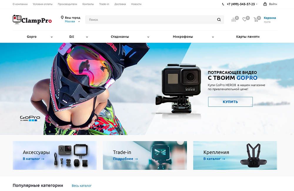 Интернет-магазин ClampPro предлагает широкий ассортимент камер GoPro и техники DJI, а также стедикамов, микрофонов и прочих аксессуаров для блогеров и экстремалов. Компания имела собственный сайт на OpenCart с ограниченным функционалом и слабыми показателями. Мы подобрали готовое решение Аспро и выполнили переезд на Битрикс. Подключили и настроили мультирегиональность на крупные города миллионники, всего 20 поддоменов. Автоматически наполнили сайт товарами с помощью парсинга cайтов конкурентов. Настроили Real-Time обмен с 1С. Настроили модули оплаты и доставки. Выполнили внутреннюю оптимизацию и работы по продвижению сайта. За полгода трафик посетителей из поиска увеличился в 15 раз.